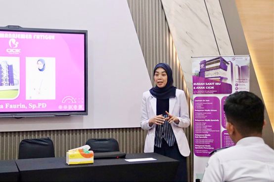 Sementara itu, dr. Muthia Faurin menyampaikan materi penyuluhan mengenai manajemen kelelahan kerja dan P3K. Ia menekankan pentingnya kemampuan pekerja dalam mengenali tanda-tanda kelelahan, menjaga kebugaran tubuh, serta melakukan penanganan awal yang tepat saat menghadapi situasi darurat.