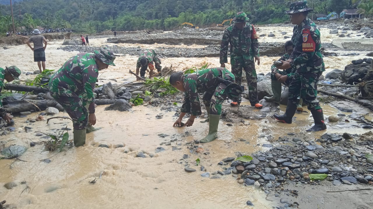 Dengan peralatan seadanya, Babinsa dan warga membersihkan material lumpur, kayu, serta bebatuan sisa banjir yang menutup badan jalan. Upaya ini dilakukan demi memastikan akses sementara dapat digunakan warga sambil menunggu penanganan lebih lanjut dari pihak terkait.