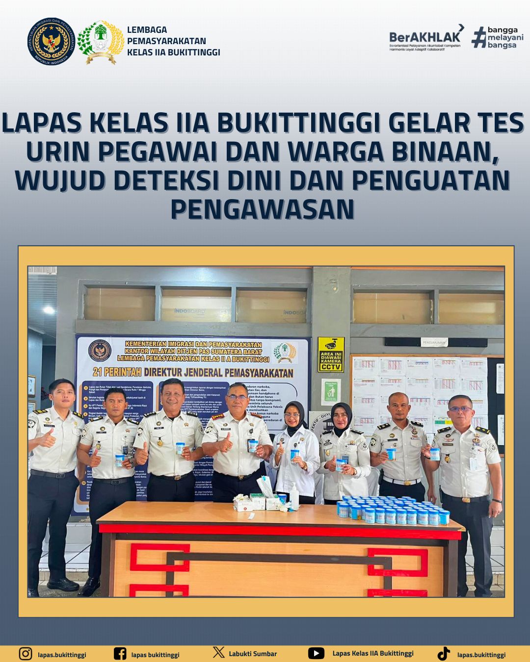 “Tes urin ini merupakan bagian dari upaya deteksi dini dan penguatan pengawasan internal, baik terhadap pegawai maupun warga binaan, guna memastikan Lapas Kelas IIA Bukittinggi tetap bersih dari narkoba serta terjaganya integritas seluruh jajaran,” tegasnya.