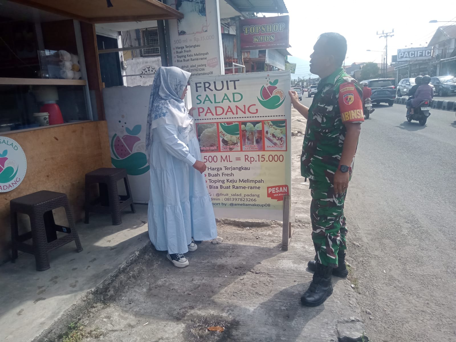 KORAMIL 01 PBU | Upaya menjaga ketertiban dan keselamatan pengguna jalan terus dilakukan Babinsa Koramil 01 Padang Barat Utara. Babinsa Kelurahan Alai Parak Kopi, Serma Yunalizal, mendampingi Kasi Trantib Kelurahan Alai Parak Kopi dalam kegiatan penyampaian imbauan kepada para pedagang agar tidak meletakkan spanduk di bibir jalan.