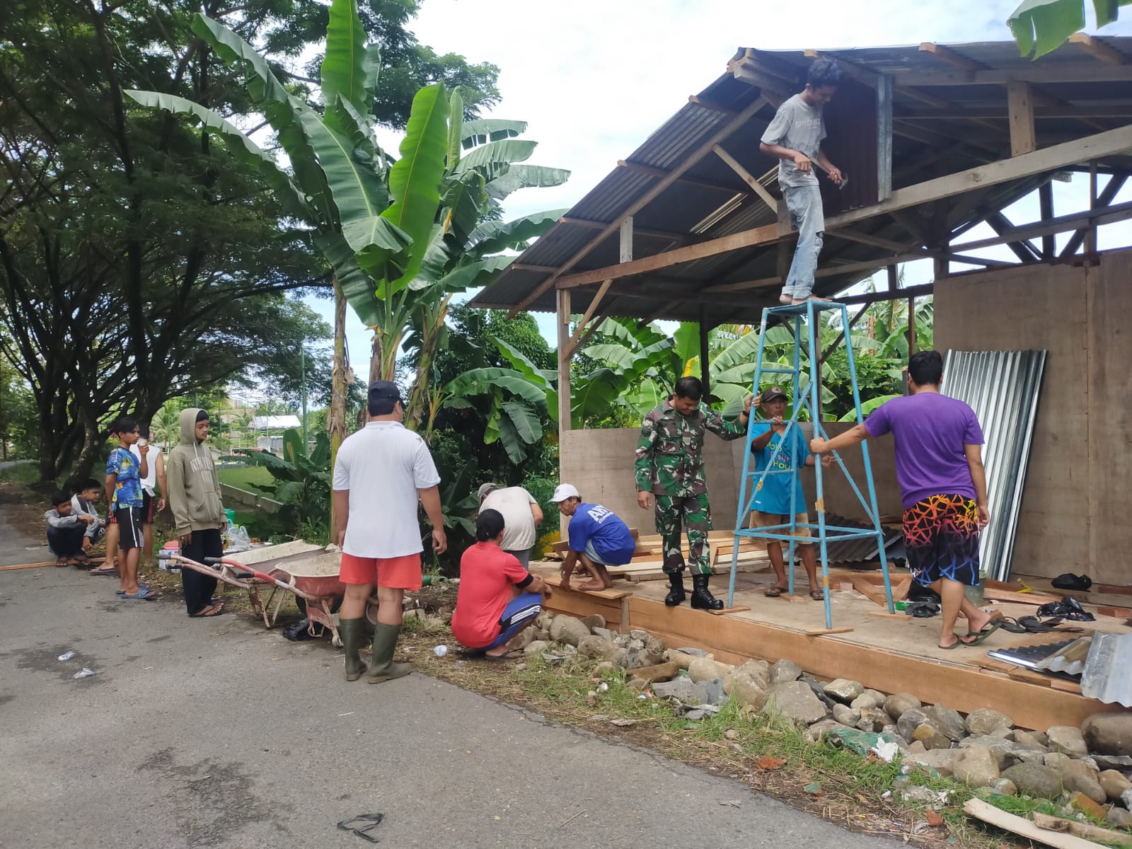 KORAMIL 01 PBU | Babinsa Koramil 01/Padang Barat–Padang Utara (PBU) Kelurahan Ulak Karang Utara, Serka Jamarin, turut serta berpartisipasi aktif bersama warga binaannya dalam kegiatan pembangunan pos ronda sebagai upaya memperkuat keamanan dan ketertiban lingkungan.
