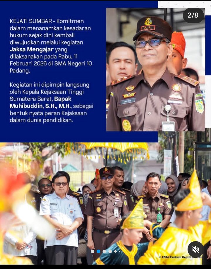 SUMBAR | Komitmen Kejaksaan Tinggi Sumatera Barat dalam menanamkan kesadaran hukum sejak dini kembali ditegaskan melalui program Jaksa Mengajar yang digelar di SMA Negeri 10 Padang, Rabu 11 Februari 2026. Kegiatan ini dipimpin langsung oleh Kepala Kejaksaan Tinggi Sumatera Barat, Muhibuddin, S.H., M.H., yang turun langsung ke ruang kelas dan berinteraksi dengan para siswa.