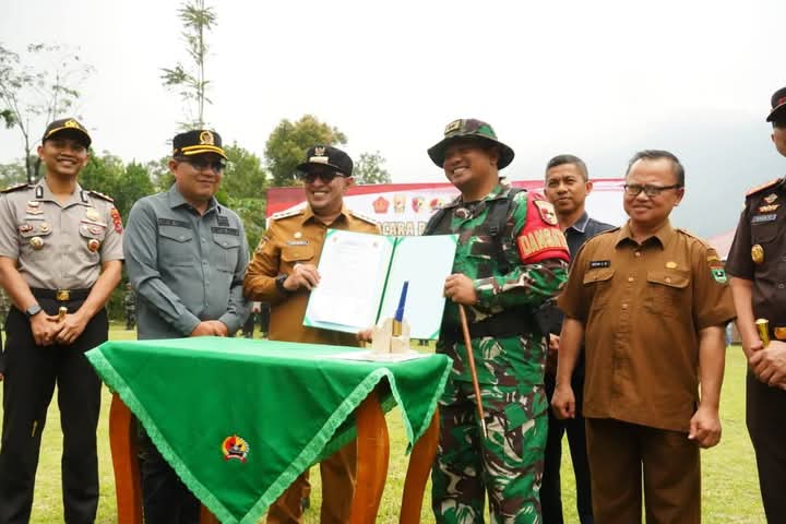 Pembukaan TMMD ke-127 yang digelar Kodim 0307/Tanah Datar di bawah jajaran Kodam XX/TIB berlangsung khidmat. Kegiatan diawali dengan laporan Komandan Kodim 0307/Tanah Datar Letkol Inf Agus Priyo Pujo Sumedi kepada Bupati, dilanjutkan dengan pemukulan gong serta penyerahan alat kerja secara simbolis sebagai tanda dimulainya program terpadu lintas sektoral tersebut.