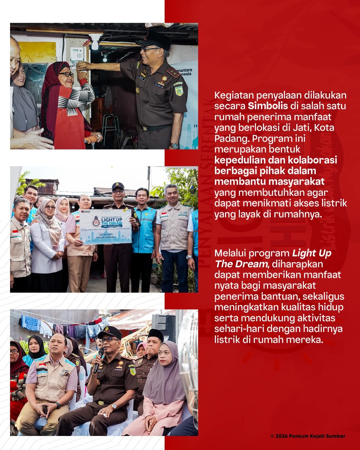 Momentum bersejarah itu turut disaksikan langsung oleh Kepala Kejaksaan Tinggi Sumatera Barat, Muhibuddin, S.H., M.H., yang hadir bersama jajaran dalam kegiatan penyalaan listrik secara simbolis bagi masyarakat penerima manfaat program sosial tersebut.