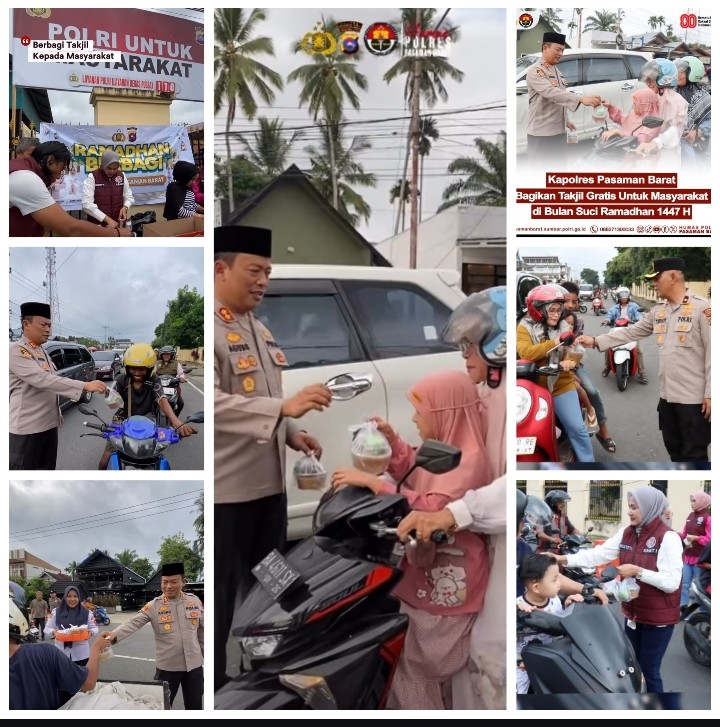 Momen tersebut berlangsung pada Selasa sore, 10 Maret 2026, di depan Markas Komando Polres Pasaman Barat. Kegiatan berbagi takjil itu menjadi salah satu wujud kepedulian sosial yang digelar jajaran Polres Pasaman Barat selama bulan suci Ramadan 1447 Hijriah.