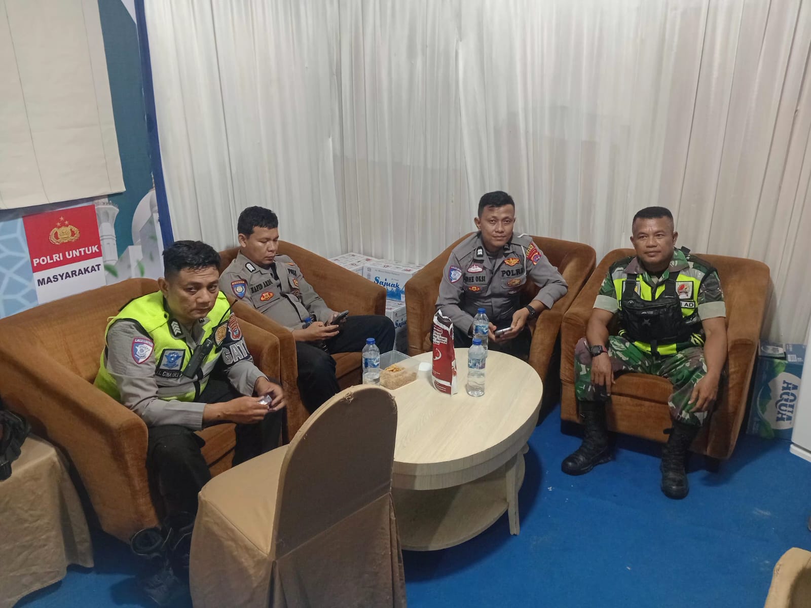 Momen kebersamaan itu berlangsung dalam suasana santai namun penuh makna. Bertempat di sebuah ruang istirahat, para aparat terlihat berdiskusi ringan sambil tetap siaga menjalankan tugas masing-masing.