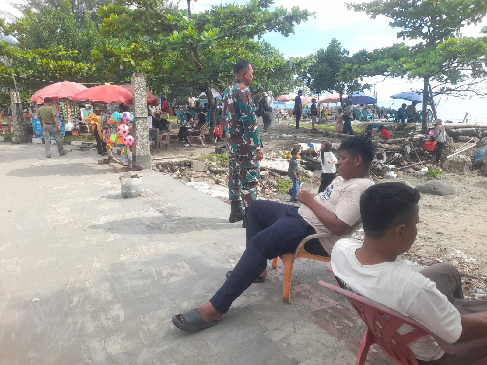 Sertu Hendri Patrizon terlihat berbaur dengan pengunjung, menyapa secara humanis serta memberikan imbauan agar tetap menjaga ketertiban dan keselamatan selama berada di kawasan pantai dan Danau Cimpago.