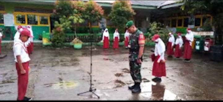 KORAMIL 01 PBU | Di bawah guyuran hujan yang membasahi halaman sekolah, semangat kebangsaan tetap berkobar saat Sertu Koko Afriandi memimpin pembinaan upacara bendera di SD Negeri 27 Kelurahan Olo, Selasa (7 April 2026).